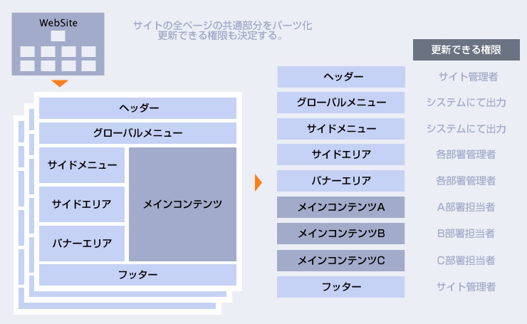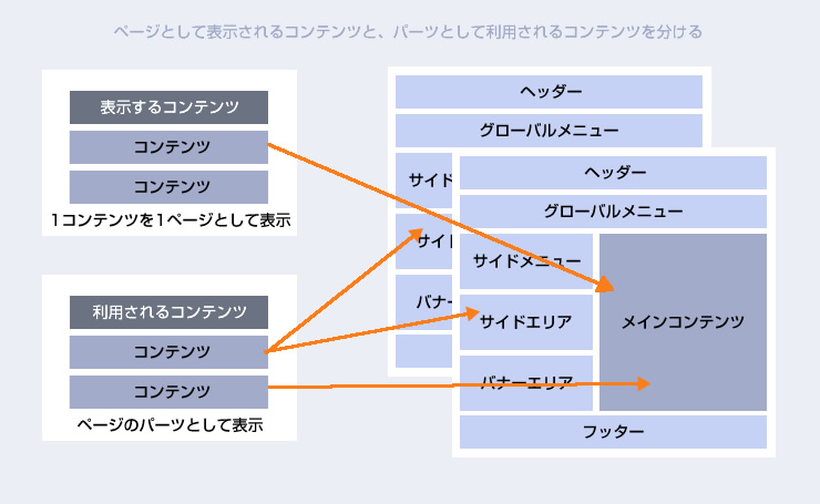 ページの構成内容により、1コンテンツに登録しきれずに他のコンテンツをパーツとして利用する場合も多くあります。