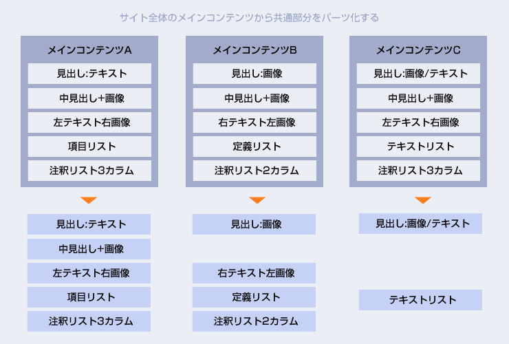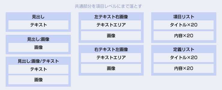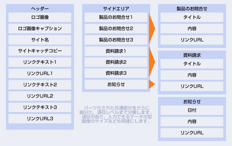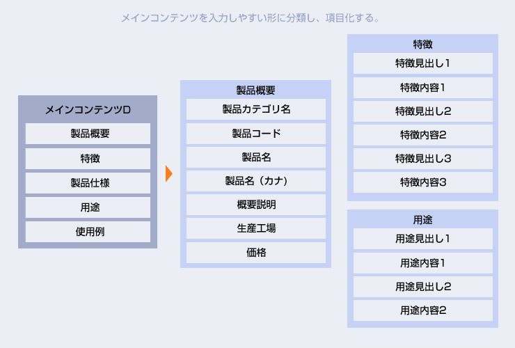 「製品のお問合せ」のようなマスターとして、あるいはコンテンツ自体がパーツとして利用されるものを分類してコンテンツを設計します。